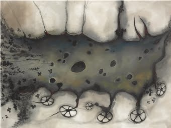 • Un informalismo telúrico que traza hados manifiestos en orografías marcadas por las incisiones de una voluntad que se concentra y existe sobre la base de esa forma de realidad viva, en gestación, mutante, aunque aparezca cargada con montañas de siglos.