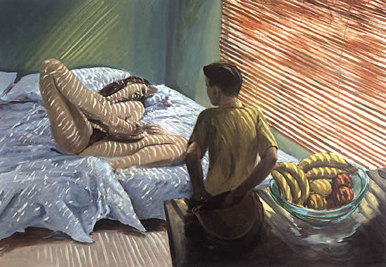 • Amy Dempsey dijo que los cuadros del canadiense FISCHL representan perturbadores psicodramas de porno blando y voyeurismo que suceden en los suburbios, y que ponen de manifiesto los peligros de la vacuidad y la conformidad inherentes al llamado sueño americano.