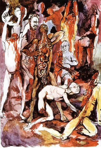 • También es el significado visual del color del sexo, de la carne, del pensamiento sedimentado en las pulsiones inevitables. No podemos rechazarlo, lo han pintado así con ese fin determinado, de tal manera que nos descubrimos en esos personajes, en la piel y órganos que queremos penetrar para experimentar con otro recurso a nuestro alcance que facilite el vivir bajo la curvatura inflexible del tiempo.