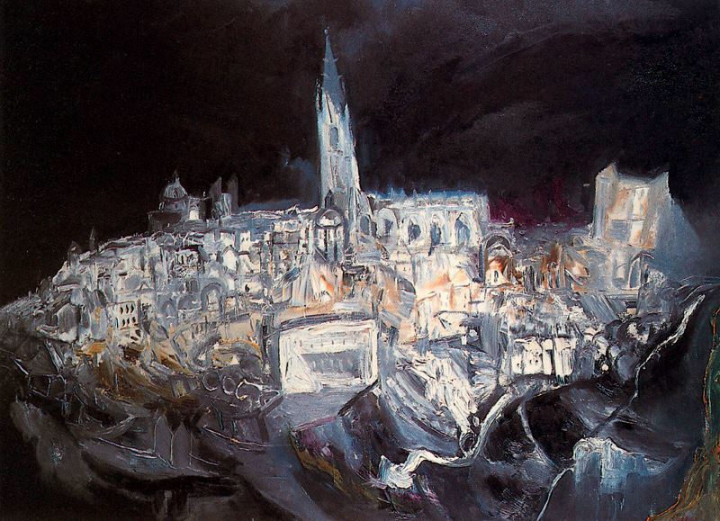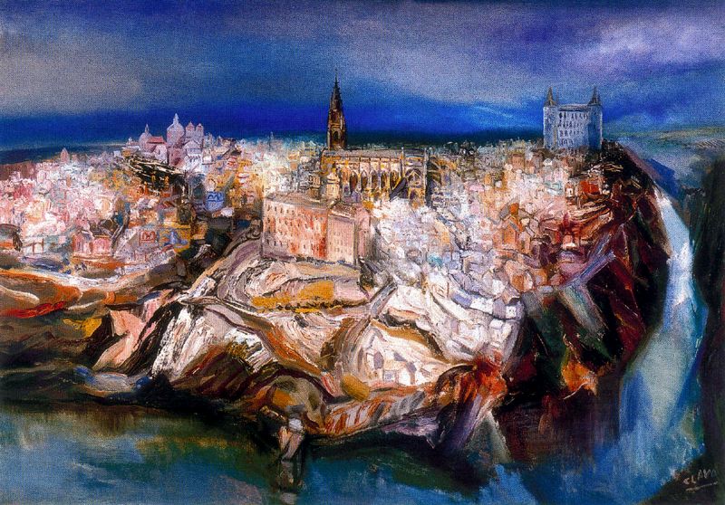 Toledo, en manos de artistas como éste, siempre nos descubre algo más a pesar de los siglos transcurridos sin moverse ni inmutarse, con sólo estar ahí quieta rememorando acontecimientos y vidas, piedras y templos, reliquias e historias, sin esperar nada más que nunca llegue el tiempo de la desesperación, cuando ya servirá únicamente para símbolo plástico de rastros, ruinas y despojos.
