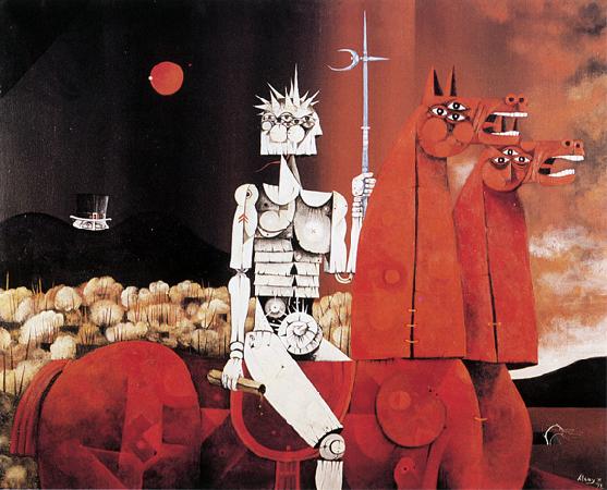 La embriaguez cromática satura el lienzo hasta el vómito. Hay un «horror vacui» que cede total y exclusivamente sitio a lo dionisiaco, a lo báquico, tal si fuese ése el sentido del discurso narcisista de esta pintura que prefiere representarse como una naturaleza lujuriosa que oculta, más que muestra, signos humanos, siluetas, esbozos corporales como si estuviesen completamente fundidos con ella.