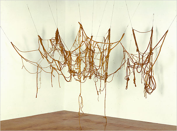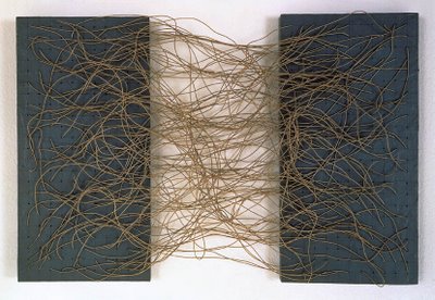 Eva Hesse, una artista alemana desaparecida prematuramente, creo que trataba de ligar vida y forma en un orden que se colgaba desordenadamente en estructuras meticulosas, cada una de ellas conteniendo su deconstrucción intuitiva y tensa producto y resultado de una construcción que no era más que el destino de lo que iba a ser reducido hasta su momento final, último, perdiéndose y ramificándose en cabos sueltos, en conflictos subyacentes que alargan pensamientos en un universo con sus fatalismos y limitaciones.