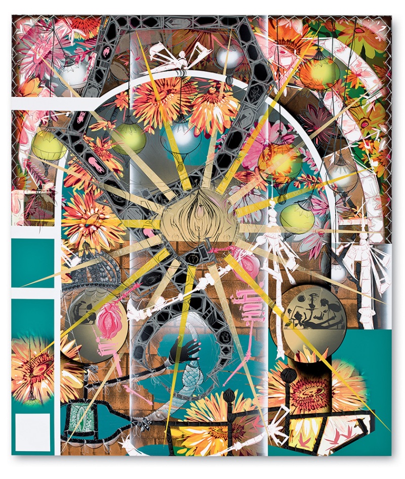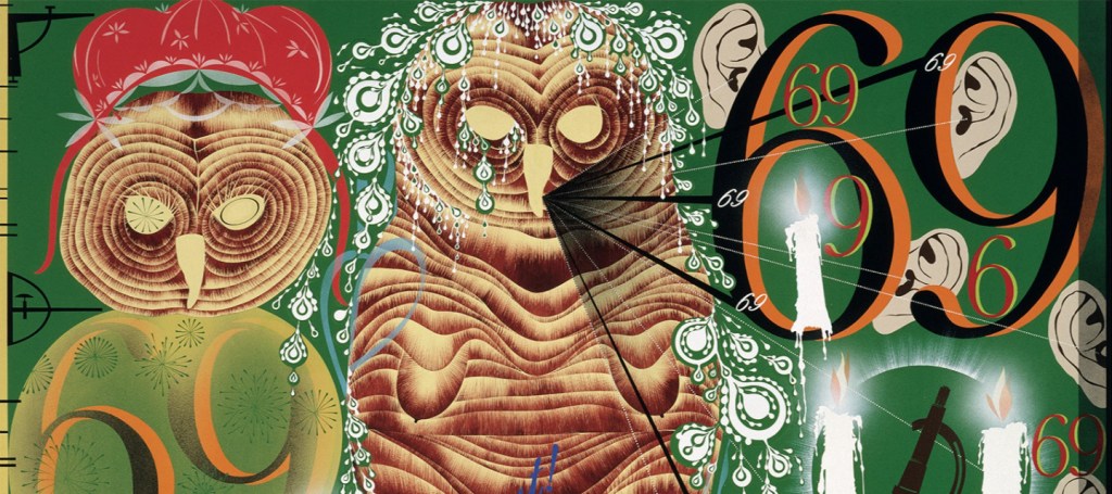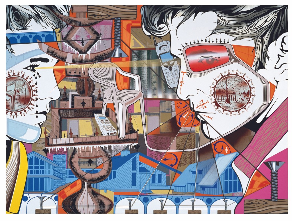 Utilizando el método del collage pero diferenciándose, sus pinturasy murales forman un caleidoscopio cromático en que lo múltiple son los innumerables iconos y figuras que funcionan en la sociedad contemporánea, la que significan y manifiestan en una secuencia que no tiene fin.